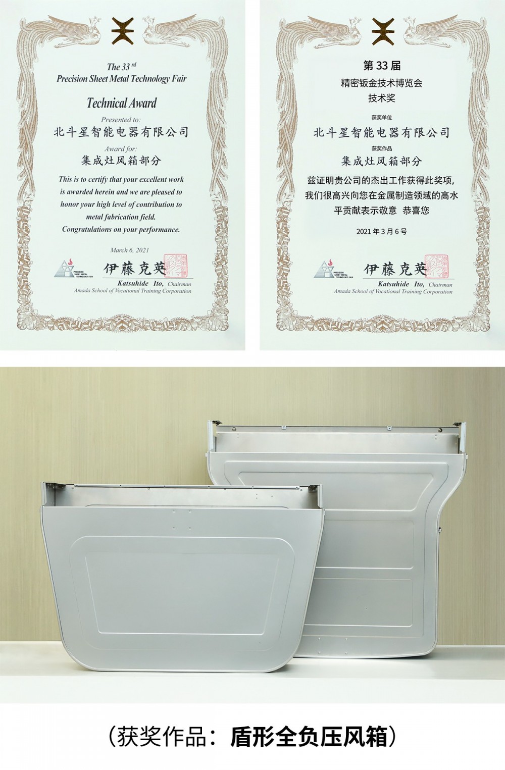 近日,歷經嚴格審核,北斗星集成灶精工鈑金制品“盾形全負壓風箱”順利通過第33屆國際精密鈑金技術博覽會專業評審,繼2019年北斗星首創天一無縫專利“一體無縫面板”之后,再次獲得“優秀鈑金技術獎”,成為行業內唯一獲此殊榮的企業。