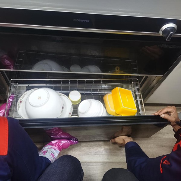 圖六:兩位服務(wù)小哥正在對消毒柜進(jìn)行清潔,裝的的碗有點(diǎn)多,他們清理的時候辛苦了。